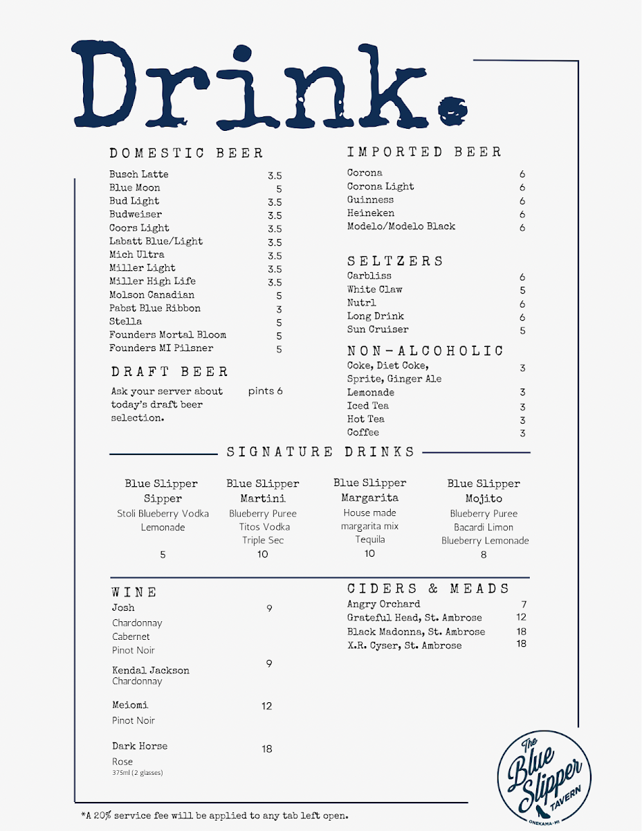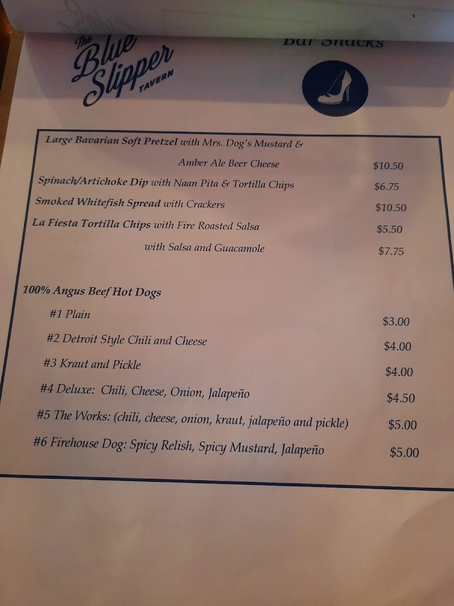 The Blue Slipper Tavern Menu